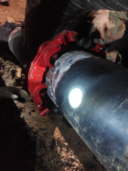 當(dāng)晚,從晚上18點開挖作業(yè)坑,由煤氣公司管線所負(fù)責(zé)人籍所長現(xiàn)場指導(dǎo)工作,直至凌晨一點,閥井全部挖開??蛻舨捎秒p向供氣模式,臨時關(guān)閉需更換閥門兩端的閥門,打開放散空放散管道余氣,去除陳舊閥門螺帽和螺栓,處理管道表面PE防腐層,切割前準(zhǔn)備工作做好后,搶險隊同志們按照步驟安裝我司旋轉(zhuǎn)式切管機ECR12,進刀、旋轉(zhuǎn)、不停進刀,不到二十分鐘時間把DN300鋼管順利切斷,整個切割過程實現(xiàn)了無火花,斷口筆直、無碎屑,更省力,使切開后的管道余氣自然排放,避免了動火切割帶來的潛在危險。 隨后,搶維修隊的隊員們按照計劃更換閥門,直至凌晨六點鐘搶維修工作才圓滿結(jié)束。事后,晉中煤氣公司管線所長及搶維修隊對我司管道冷切割工具給予很高評價,同時,能為幫助客戶解決問題,我們感到尤為的榮幸,這標(biāo)志著我司產(chǎn)品質(zhì)量受到客戶的認(rèn)可與肯定!