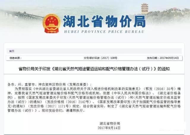 2017年發(fā)改委《關(guān)于核定天然氣跨省管道運(yùn)輸價(jià)格的通知》,根據(jù)《天然氣管道運(yùn)輸價(jià)格管理辦法(試行)》和《天然氣管道運(yùn)輸定價(jià)成本監(jiān)審辦法(試行)》有關(guān)規(guī)定,對(duì)中石油北京天然氣管道有限公司等13家跨省管道運(yùn)輸企業(yè)進(jìn)行了定價(jià)成本監(jiān)審,核定了中石油北京天然氣管道有限公司等13家跨省管道運(yùn)輸企業(yè)管道運(yùn)輸價(jià)格。自2017年9月1日起執(zhí)行。